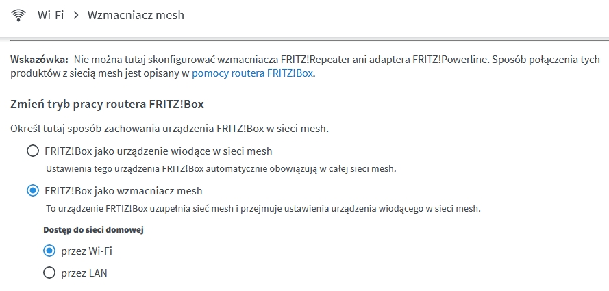 Aby spiąć dwa routery radiowo, wchodzimy do menu Wi-Fi>Wzmacniacz mesh i zaznaczamy opcję „przez Wi-Fi” i wybieramy sieć, z którą chcemy router bezprzewodowo połączyć.