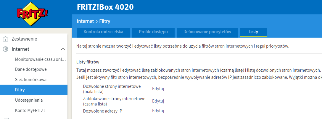 Routery FRITZ!Box pozwalają na stworzenie czarnej i białej listy zawierające do 500 elementów |