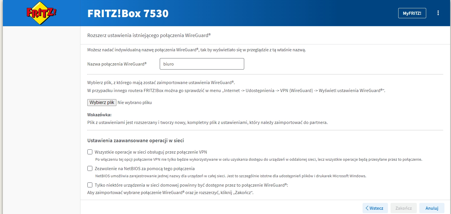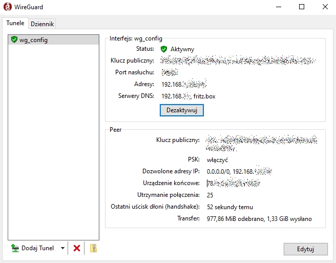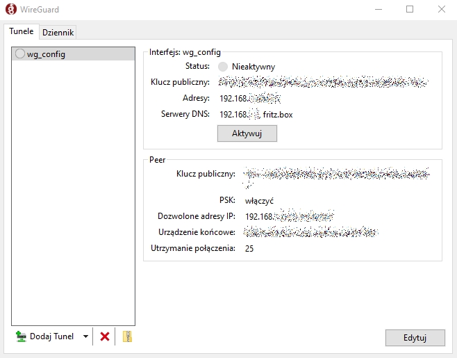 Konfiguracja połączenia na komputerze z systemem Windows i iOS również jest również banalnie prosta. Wszystko dzięki aplikacji WireGuard i kreatorowi na stronie routera FRITZ!Box. Plik ustawień jest pobierany na komputer. Następnie w aplikacji WireGuard należy wskazać klikając „Dodaj Tunel” i wskazać plik z rozszerzeniem „.conf” domyślna nazwa pliku to „wg_config”. Połączenie nawiązywane jest po kliknięciu w „Aktywuj”.