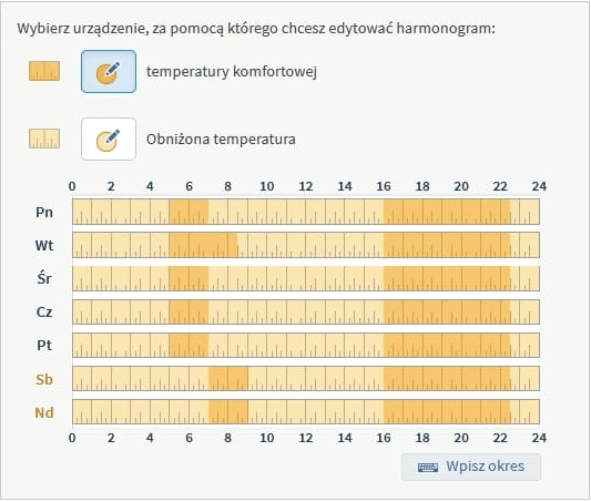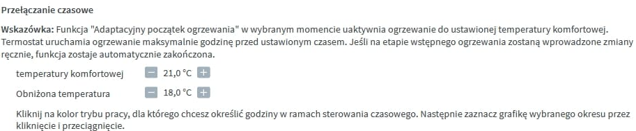 Przełączanie czasowe, zgodne z rytmem życia osób zamieszkujących dom energooszczędny, pozwala zoptymalizować działanie ogrzewania tak, by przy okazji oszczędzania, zwiększyć komfort przebywania w poszczególnych pomieszczeniach.Dla przykładu, zaprezentowana powyżej konfiguracja zmniejsza temperaturę w salonie do 18 °C w godzinach nocnych. Temperatura jest zwiększana od godz. 5:00, aby mieszkańców po przebudzeniu nie przywitał niemiły chłód. Około godz. 7:00 grzejniki redukują przepływ gorącej wody i powoli stygną, gdy mieszkańcy wychodzą do pracy i szkoły. Przez część roboczą dnia temperatura jest zmniejszana, aby nie grzać pustego mieszkania.Harmonogram możemy konfigurować dla każdego dnia indywidualnie. Na przykład we wtorek grzanie utrzymane jest parę godzin dłużej, gdyż jeden z domowników rozpoczyna pracę później. Harmonogram wygląda inaczej także w weekend, gdy mieszkańcy mają zwyczaj spać trochę dłużej.Nawet pobieżna analiza pokazuje, że tak skonfigurowany harmonogram pozwala – co ważne, w sposób praktycznie niezauważalny dla mieszkańców – zmniejszyć zużycie energii cieplnej przez większą część doby, tj. na ok. 15,5 godz! To oznacza bardzo wymierne oszczędności.