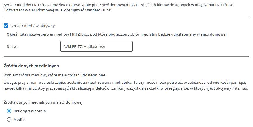 Uzupełnieniem NAS w routerach FRITZ!Box jest możliwość udostępniania zasobów dyskowych, w szczególności multimediów, za pomocą Mediaserwera zgodnego ze standardem UPnP. Dzięki tej funkcji, nasze zdjęcia, muzykę i filmy można oglądać bezpośrednio z sieci za pomocą telewizorów smart, sieciowych odtwarzaczy multimedialnych.