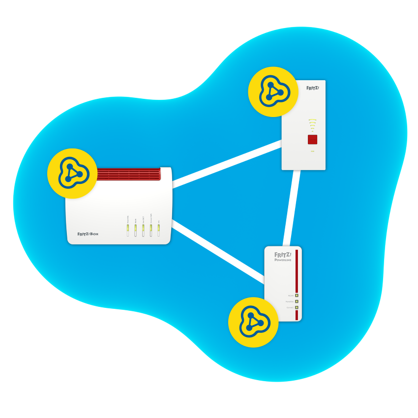 Każdy punkt dostępowy sieci MESH, np. FRITZ!Repeater, czy też adapter FRITZ!Powerline, jest swoistym „przedłużeniem” zasięgu sieci w swojej okolicy.